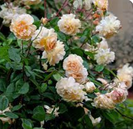 짙은 녹색 잎사귀를 배경으로 종종 살구색으로 물들인 버프 옐로우 꽃송이는