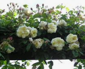 니다. 등반 습관은 옅은 노란색, 크림색 꽃송이를 보여주며 장식용 트렐리스, 울타
