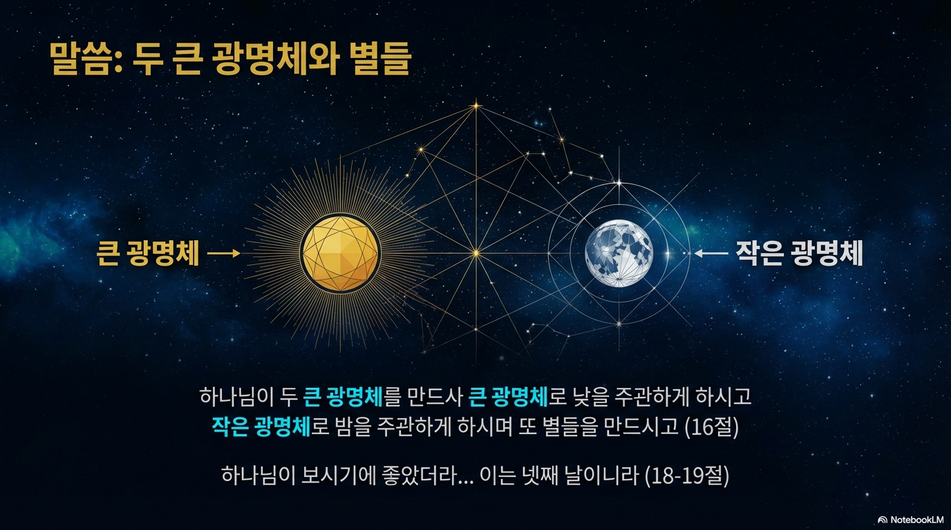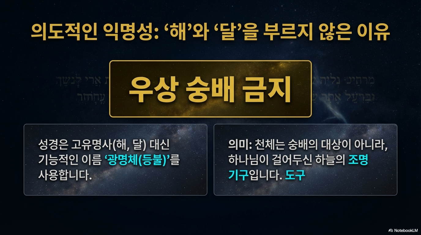 했습니다. 그러나 성경은 '해'와 '달'이라는 고유 명사 대신 **'광명체(등불)'**라는 단