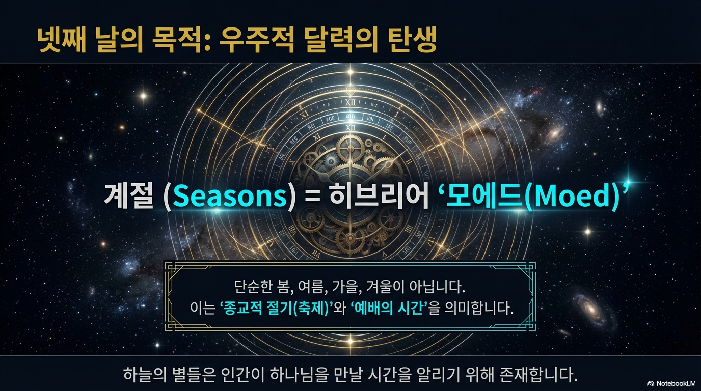 ■ 시간의 주관:넷째 날의 핵심은 '시간'입니다. 하나님은 단순히 천체를 만든 것이 아