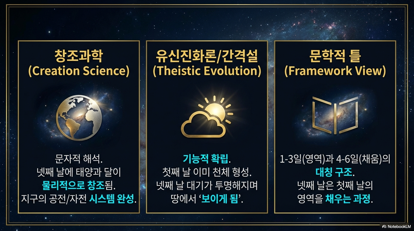 과 넷째 날의 '광명체'를 구분하며, 넷째 날에 비로소 지구의 공전과 자전 체계가 완성