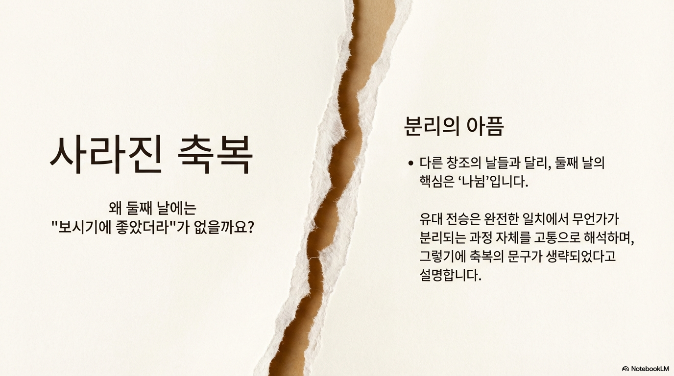 ■ 분리의 아픔: 다른 창조의 날과 달리 둘째 날에는 "보시기에 좋았더라"라는 구절이 없