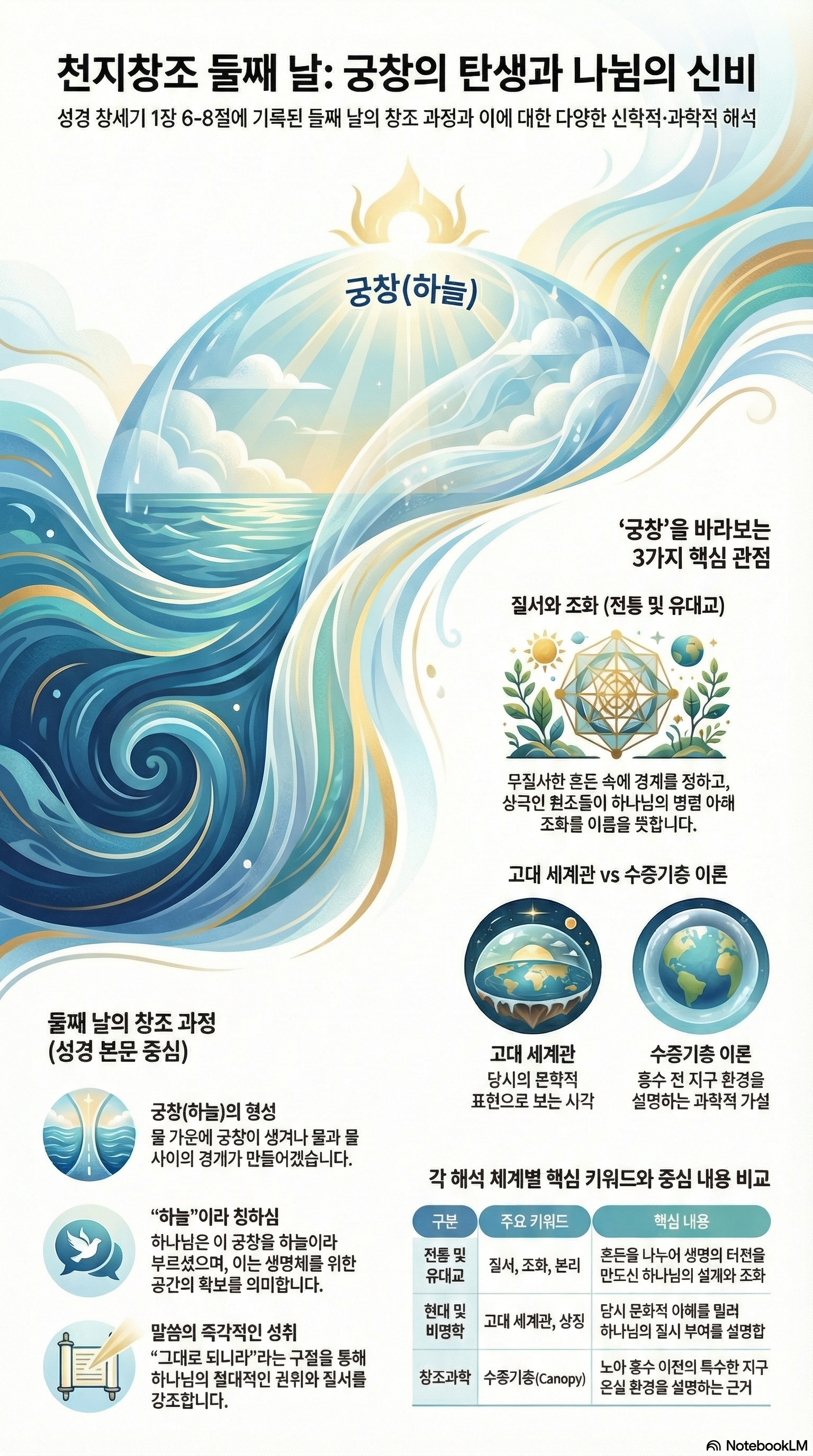 ■ 우주론적 상징: '물'은 성경에서 종종 혼돈과 심판을 상징합니다. 이를 나누셨다는 것