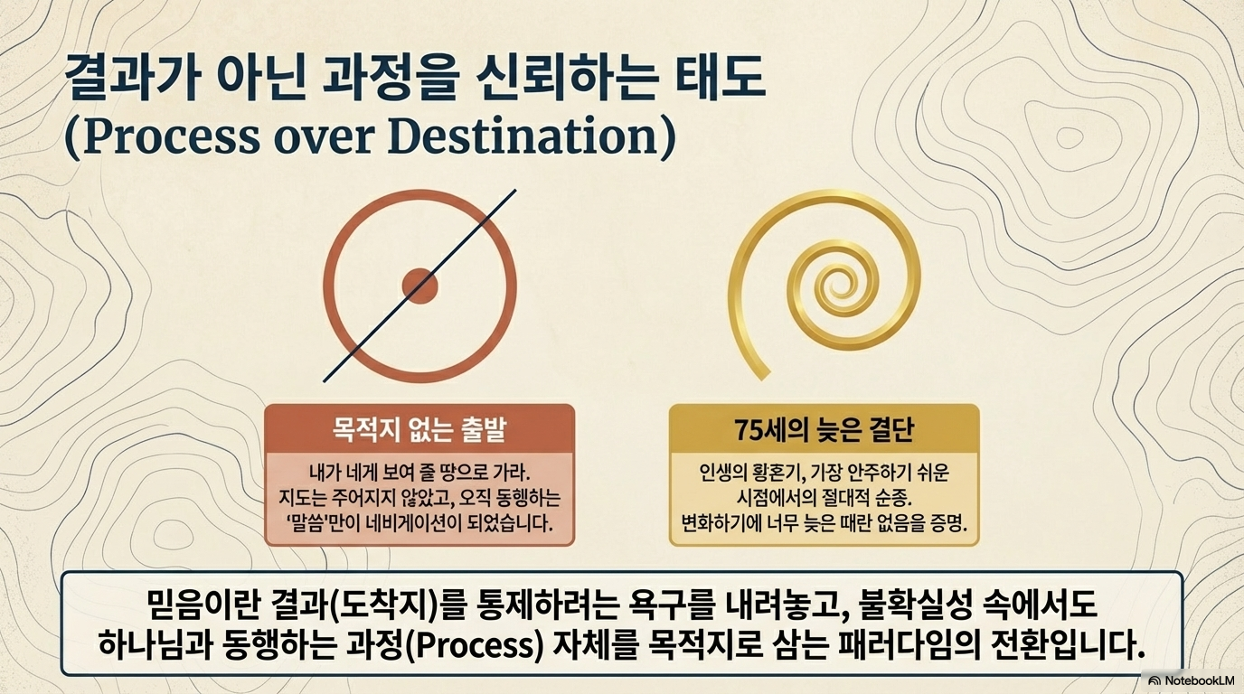 ■ 믿음의 여정(Process): 아브람은 목적지를 명확히 알지 못한 채 "말씀을 따라" 나섰