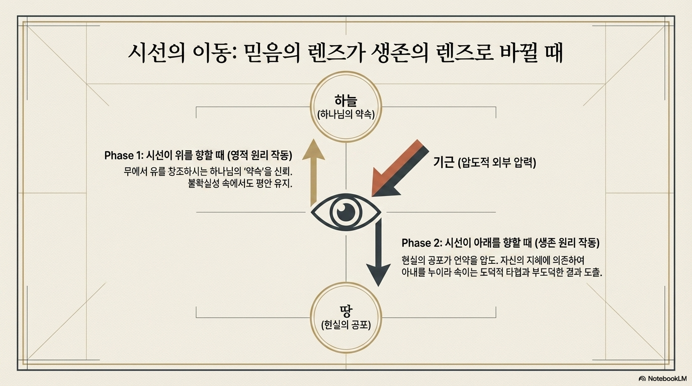 시선의 이동:아브람의 시선이 하늘(하나님)에서 땅(기근)으로 옮겨갔을 때, 그의 행동은