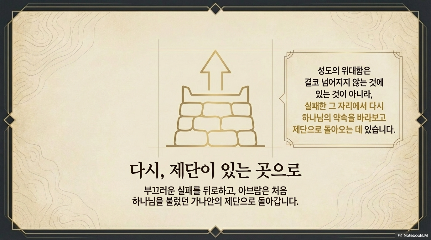 단단해지는 것임을 보여줍니다. 아브람은 이 부끄러운 실패를 뒤로하고 다시 제단이