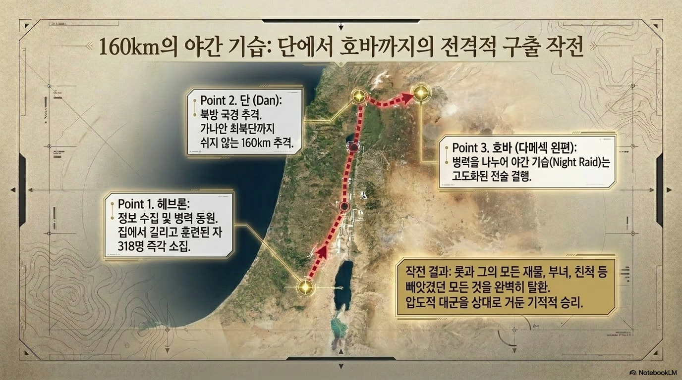 ■ 군사 동원: 아브람은 집에서 기르고 훈련된 자 318명을 거느리고 단(Dan)까지 추격