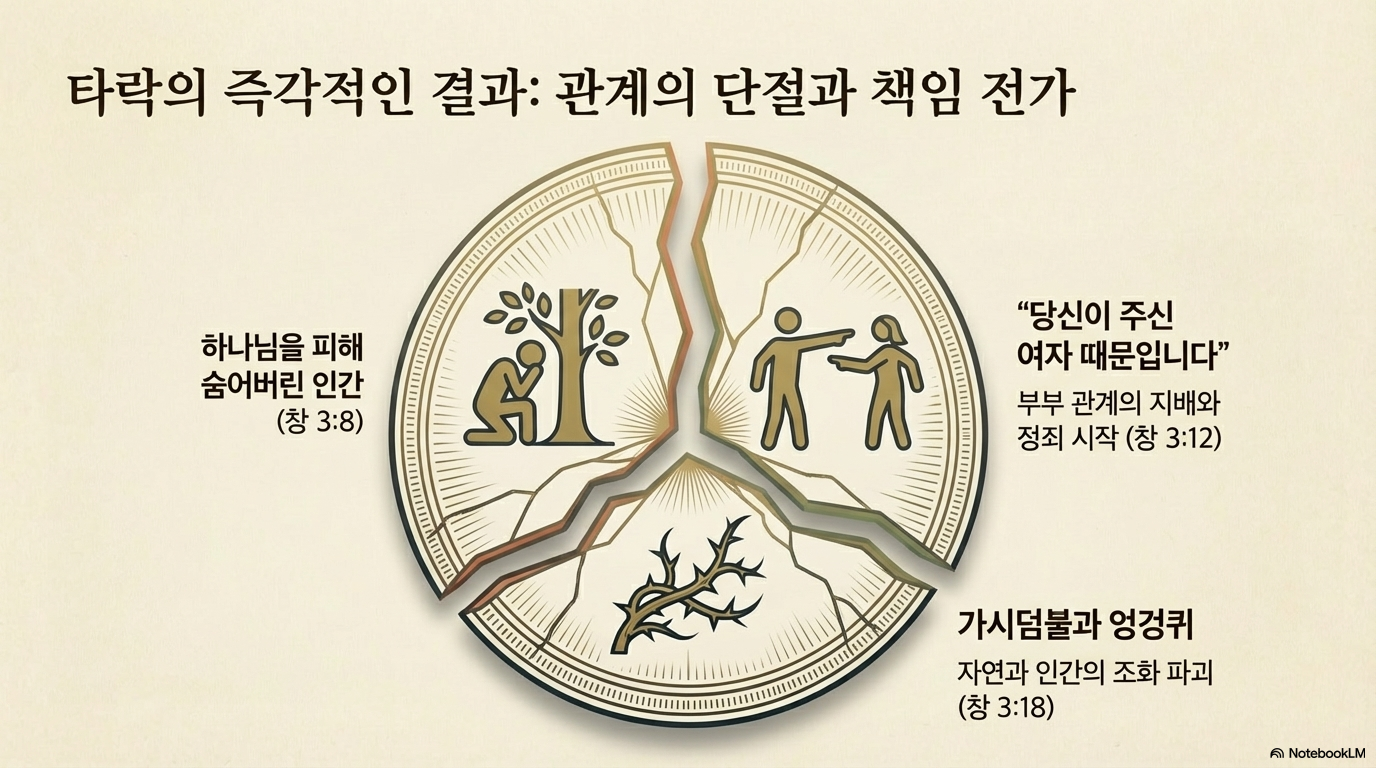 하나님과의 관계 변화를 다룹니다. 인간의 자유 의지와 유혹, 그리고 죄의 결과가 무엇