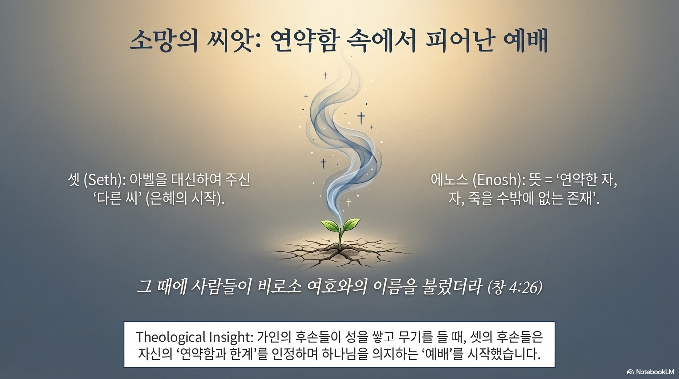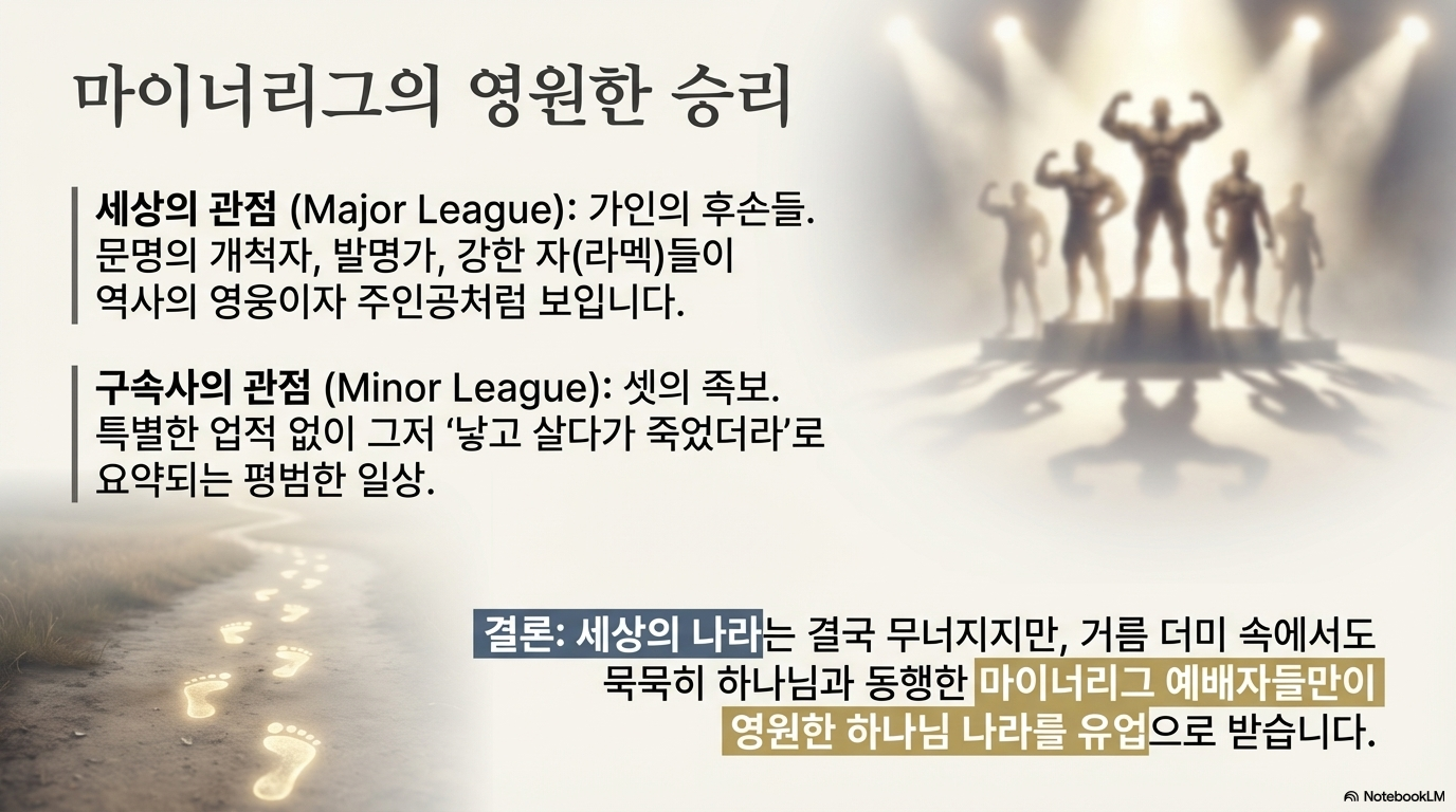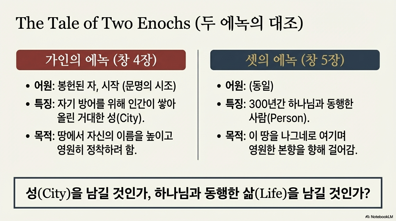 ■ 가문의 대조:가인의 족보는 하나님께 묻는 장면 없이 오직 '낳고 쌓고 만드는' 행위만