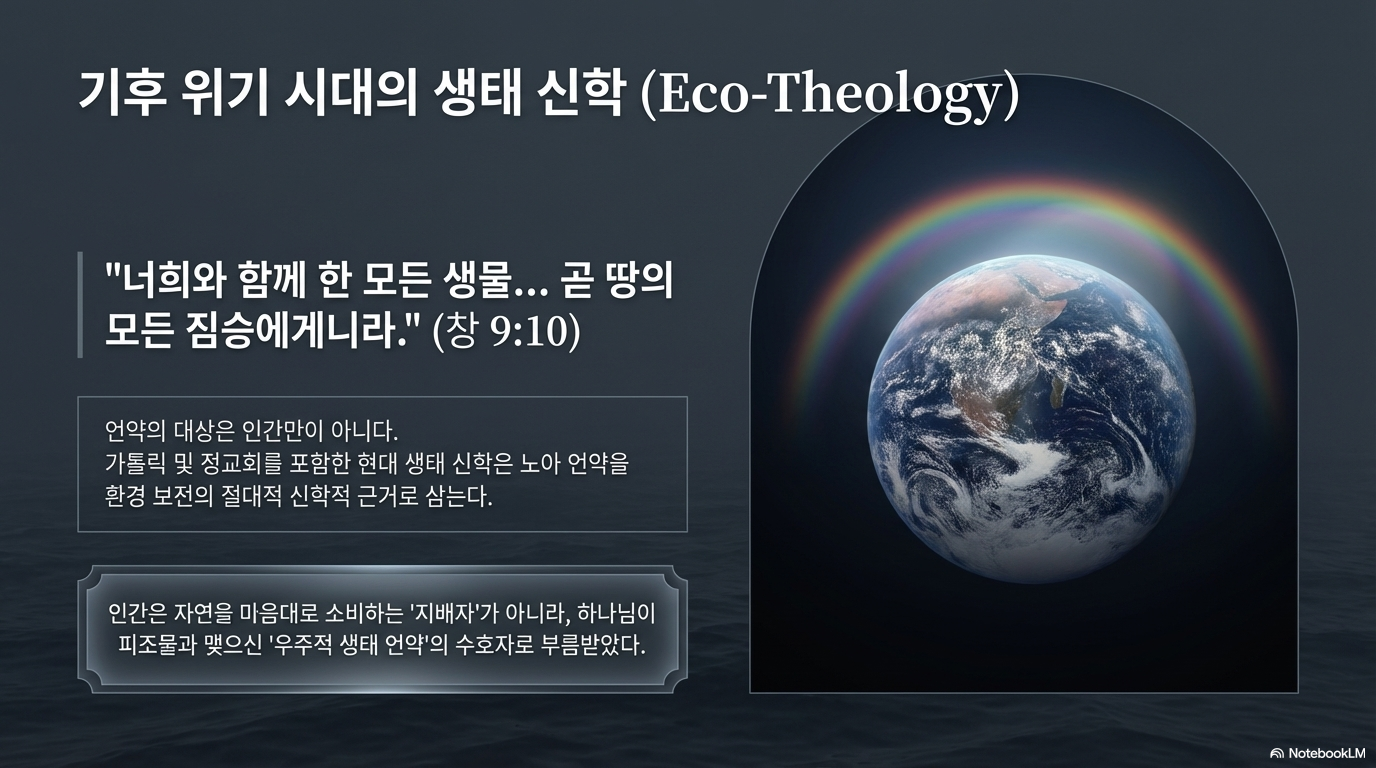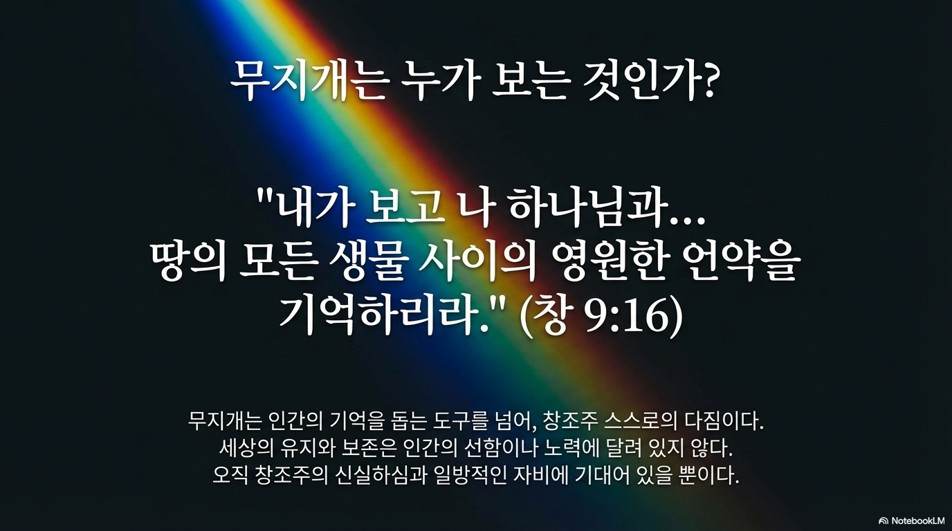 ■ 보편적 언약:이 언약은 믿는 자뿐만 아니라 '땅의 모든 생물'과 맺으신 것입니다.