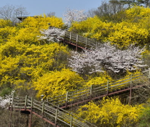 개나리는 또한 한국의 정원과 공원에서 자주 식재되며, 그 아름다움과 생명력은