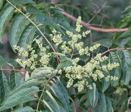 가죽나무의 꽃은 작고 연한 녹색으로, 여름철에 피어납니다.