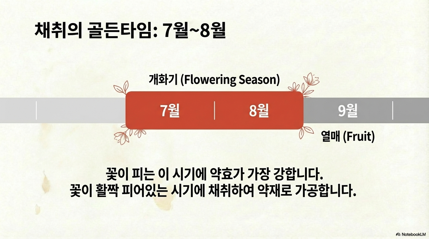 는 이명도 함께 전해집니다. 채취 시기는 주로 꽃이 피는 7~8월로, 이 시기에 건조하여