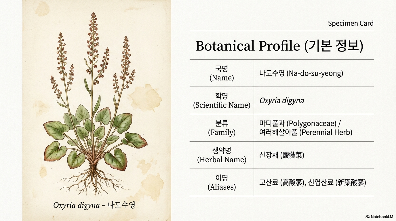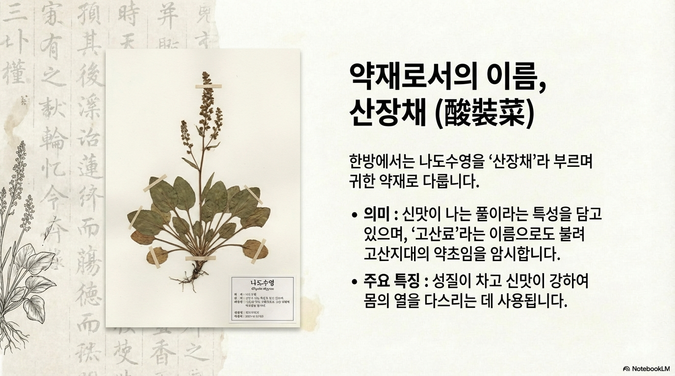 나도수영의 생약명은 산장채(酸裝菜)이며, ‘고산료(高酸蓼)’ ‘신엽산료(新葉酸蓼)’라