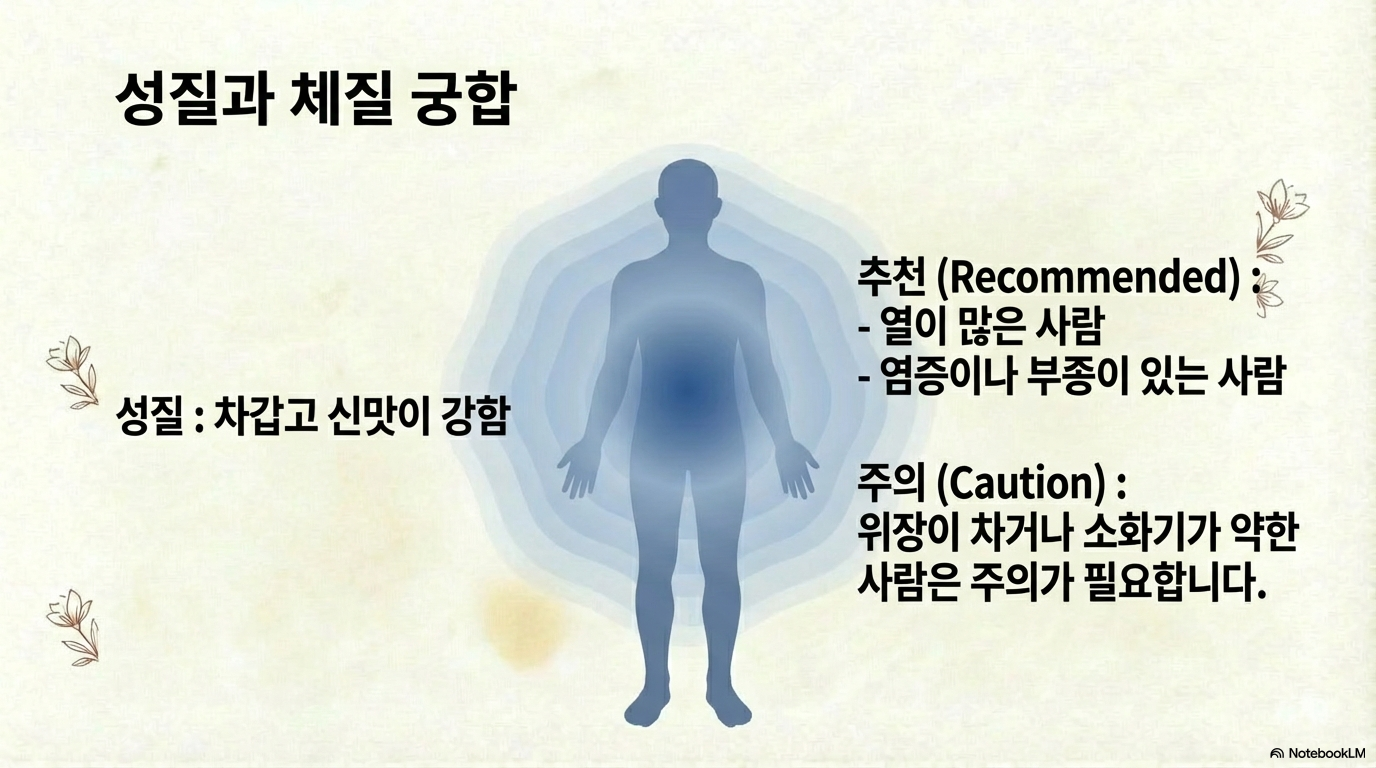 차가운 성질과 신맛이 특징으로 몸을 열내리는 효능을 지녀 열증 완화에 적합합니다.