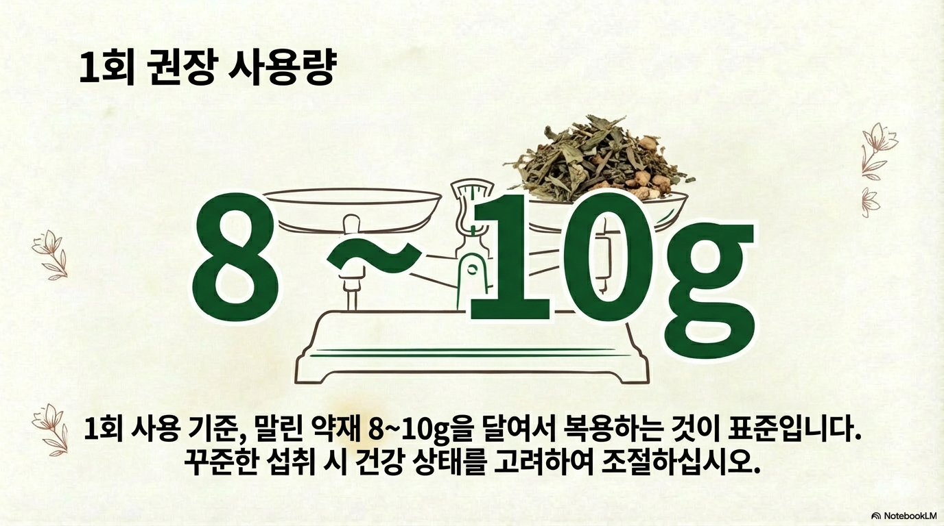 1회 기준 약 8~10그램을 달여서 사용하는 것이 표준입니다.