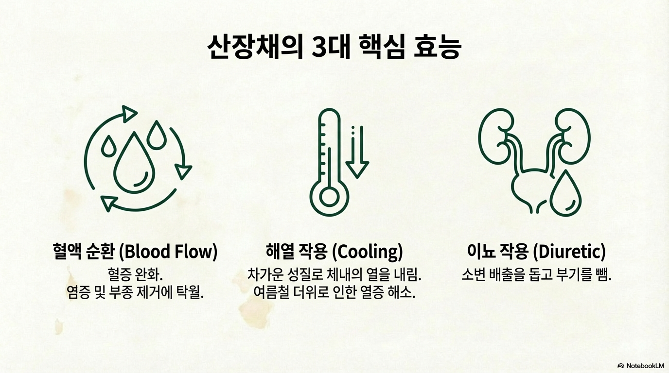 산장채는 혈액 순환 개선과 이뇨, 해열 등의 효능이 있다고 알려져 있습니다. 특히 혈증