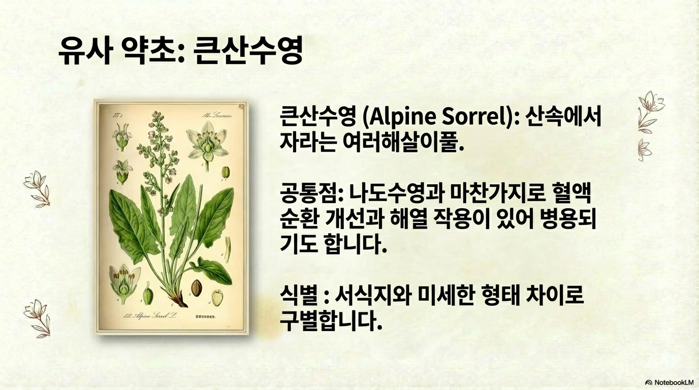 나도수영과 비슷한 효능을 가진 약초에는 산속에서 자라는 여러해살이풀인 큰산수영