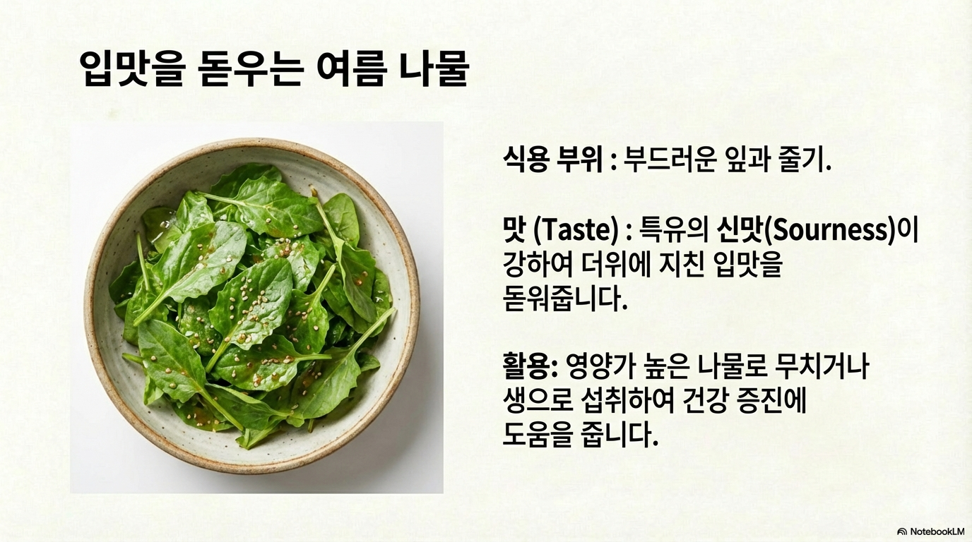 니다. 또한 부드러운 잎과 줄기는 영양가 있는 나물로도 섭취할 수 있어 건강 증진에 도