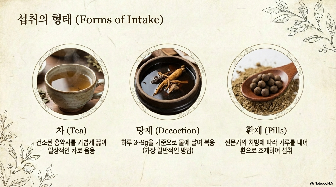 3~9g을 탕제로 복용하며, 환제 형태 시에는 전문가의 처방 아래 복용량을 조절합니다.
