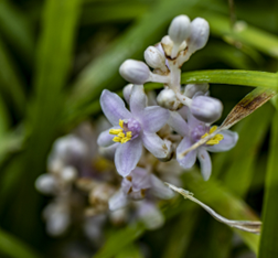 여름에 연한 자주색 또는 흰색의 작은 꽃이 핍니다. 꽃은 수상(穗狀) 꽃차례를 이루며