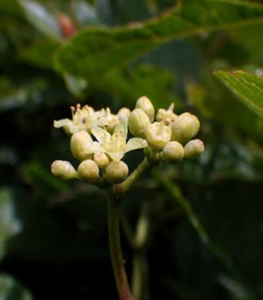 여름에 연한 황록색의 작은 꽃이 잎겨드랑이에서 모여 핍니다. 꽃차례는 취산꽃차례