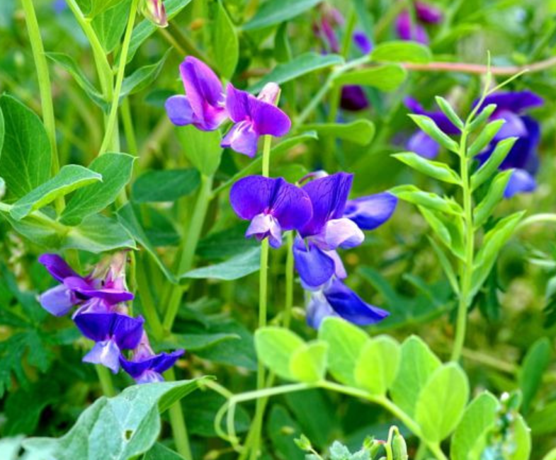 초여름에 보라색 또는 연보라색의 나비 모양 꽃이 잎겨드랑이에서 피어납니다.