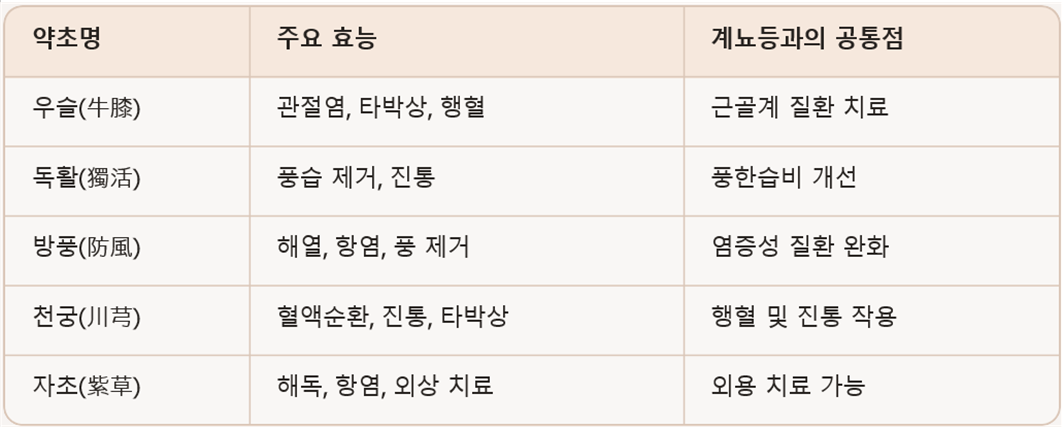 계뇨등과 유사한 효능을 가진 약초는 염증 완화, 해독, 관절염 치료 등에는 우슬, 위령선