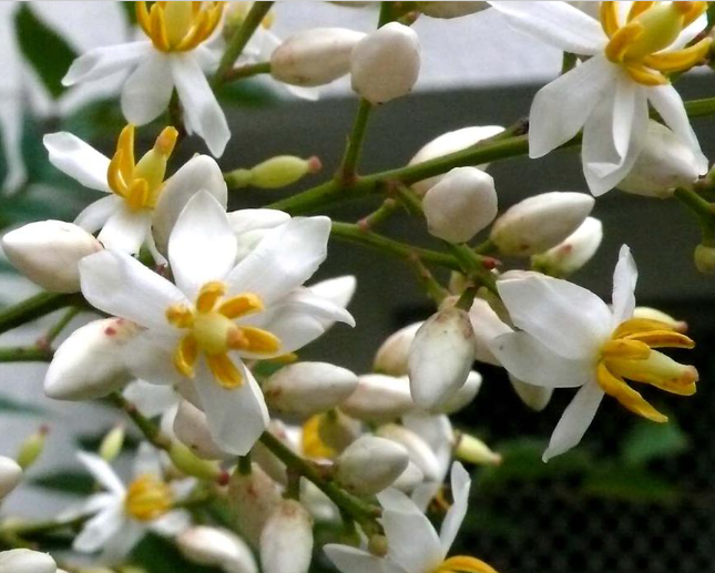 봄에 작은 흰색 또는 연한 분홍빛 꽃이 원추형 꽃차례로 핍니다. 향기는 약간 달콤합니