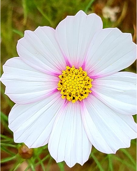 코스모스는 꽃의 구조가 대칭적이며, 중앙에는 노란색의 암술과 수술이 위치하고