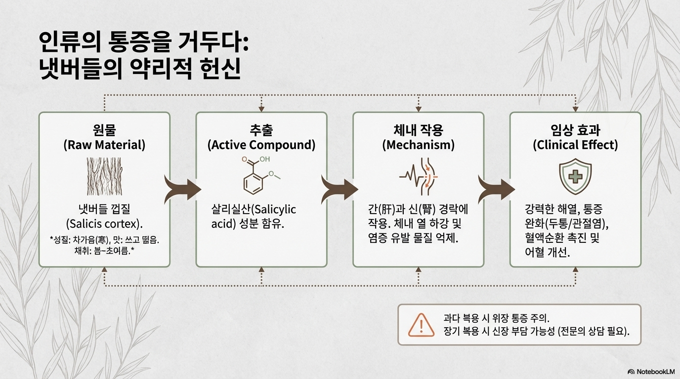 무입니다. 한방에서는 냇버들의 껍질을 중심으로 약재로 활용하며, 오래전부터 해열, 진
