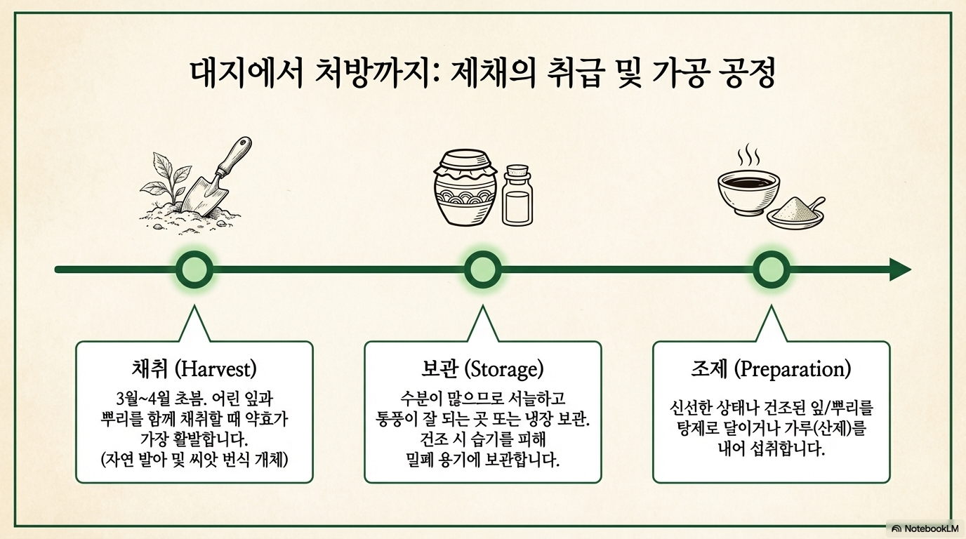 초봄(3~4월) 어린 잎과 뿌리를 채취하는 것이 가장 좋으며, 이 시기 약효가 활발합니다.