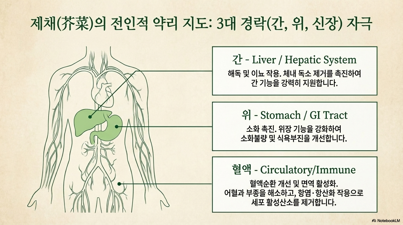 ■ 냉이와 같은 십자화과 식물들(겨자잎 등):비슷한 약리 성분을 포함해 해독과 혈액순