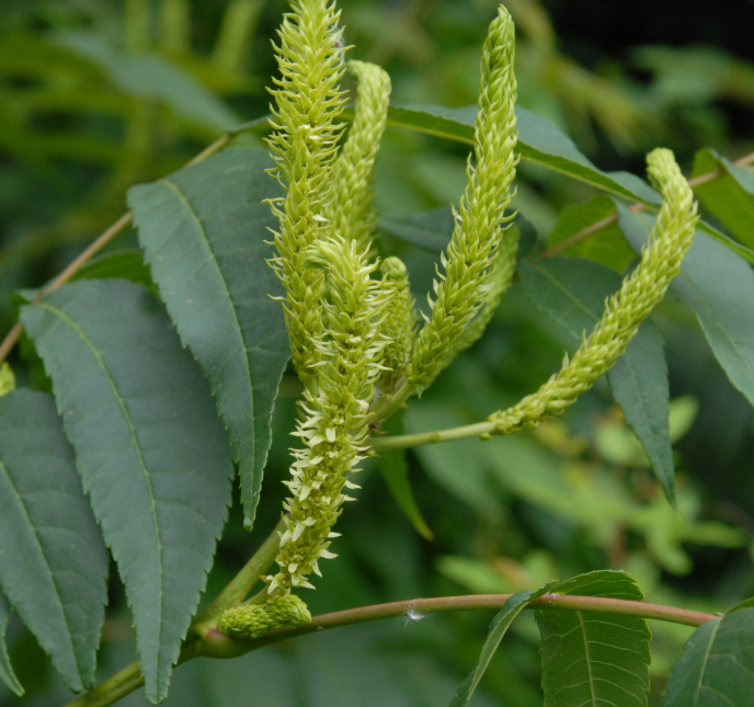 5~6월경에 녹황색의 작은 꽃들이 여러 개 모여 이삭 모양으로 핍니다. 수꽃차례와 암