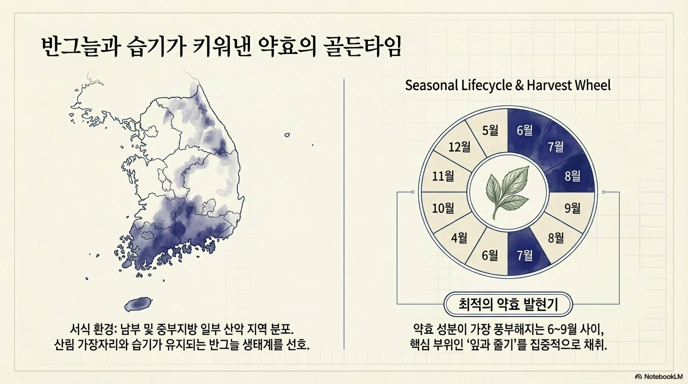 잎과 줄기는 주로 여름에서 초가을(6~9월)에 채취하며, 이 시기가 약효 성분이 가장