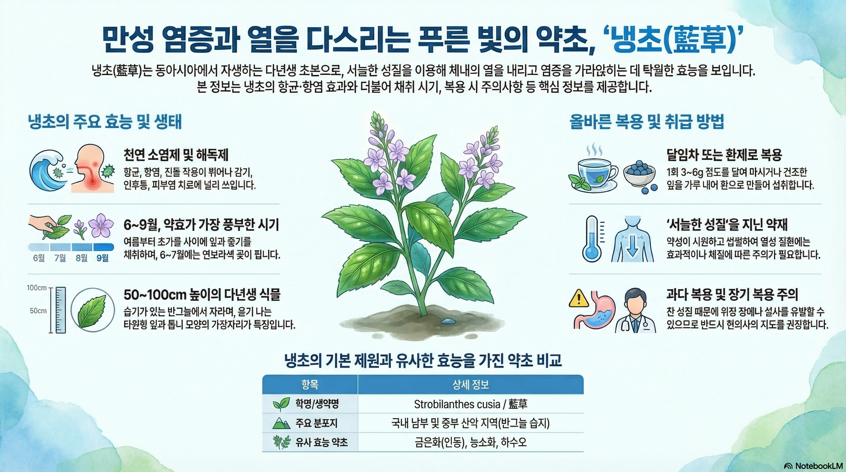 냉초의 생약명은 ‘藍草’이며, 과학적 명칭은 Strobilanthes cusia (Nees) Kuntze입