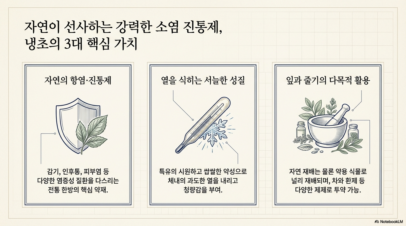 냉초는 성질이 시원하고 쌉쌀하며, 청량감을 줍니다. 약성이 서늘하여 열을 내리고 염증