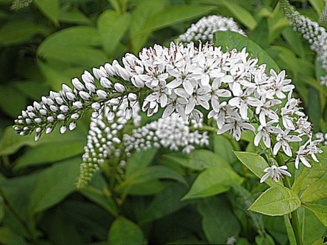 꽃은 7월에서 9월 사이에 피며, 줄기 끝에 하얀색의 작은 꽃들이 빽빽하게 모여 긴 이삭