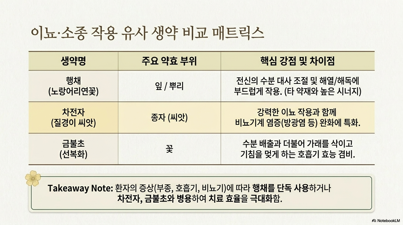 차전자, 금불초 등이 부종 해소와 이뇨 작용에서 비슷한 효능을 내며,