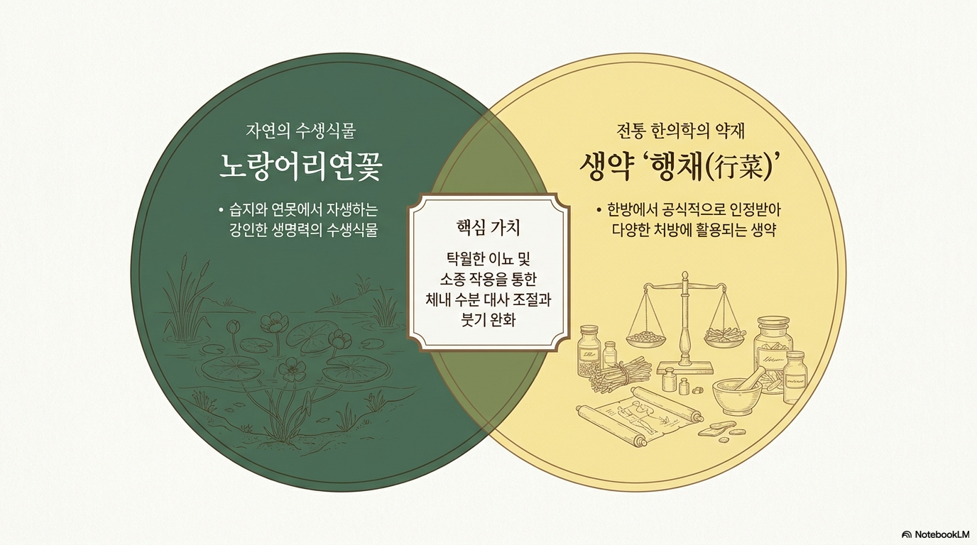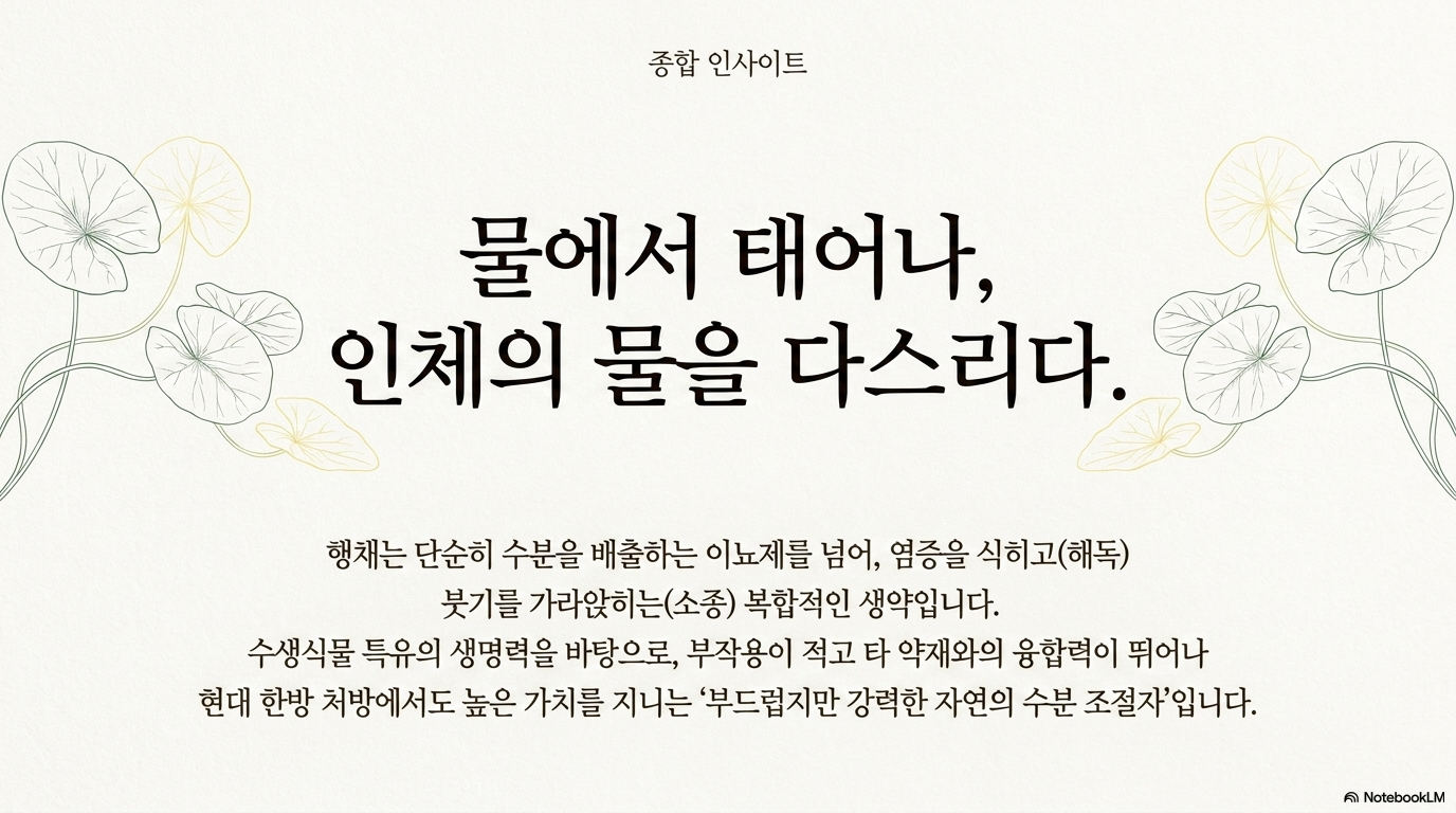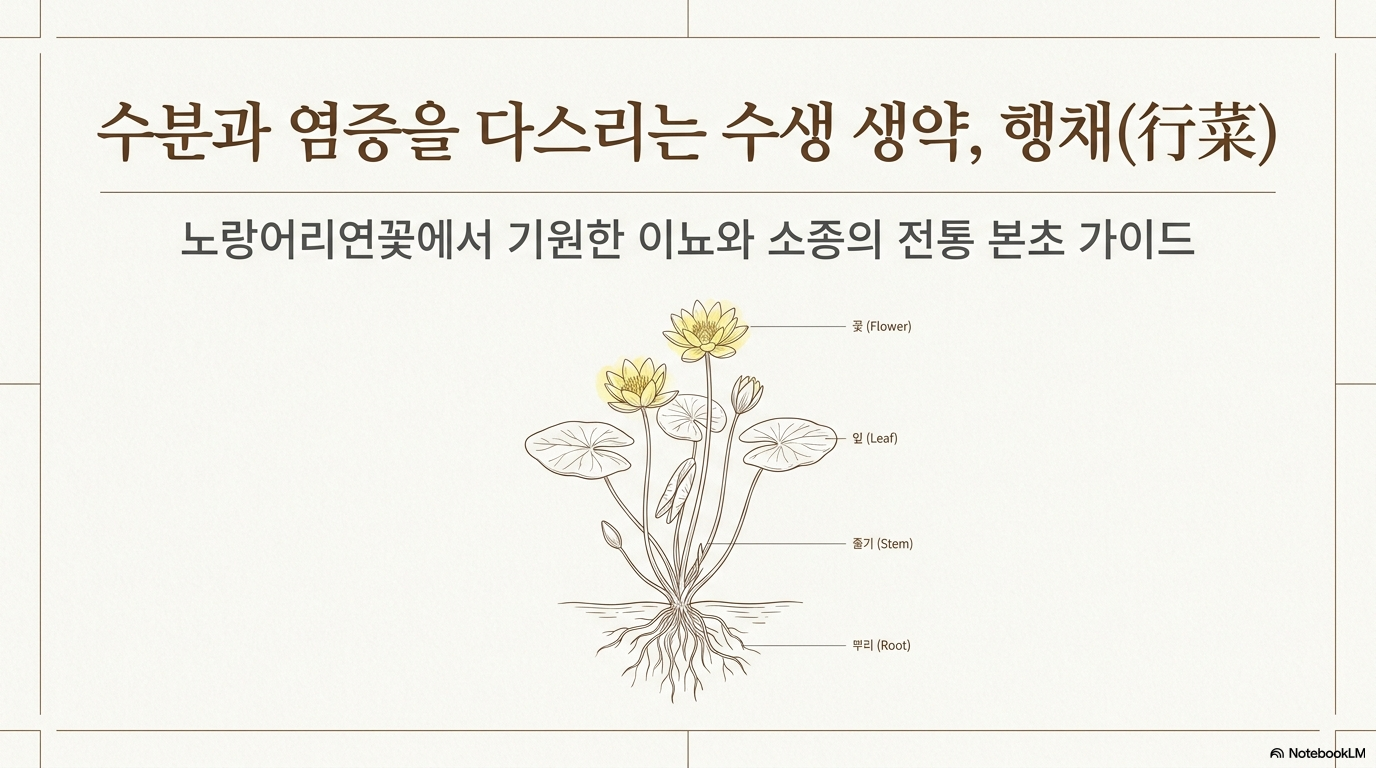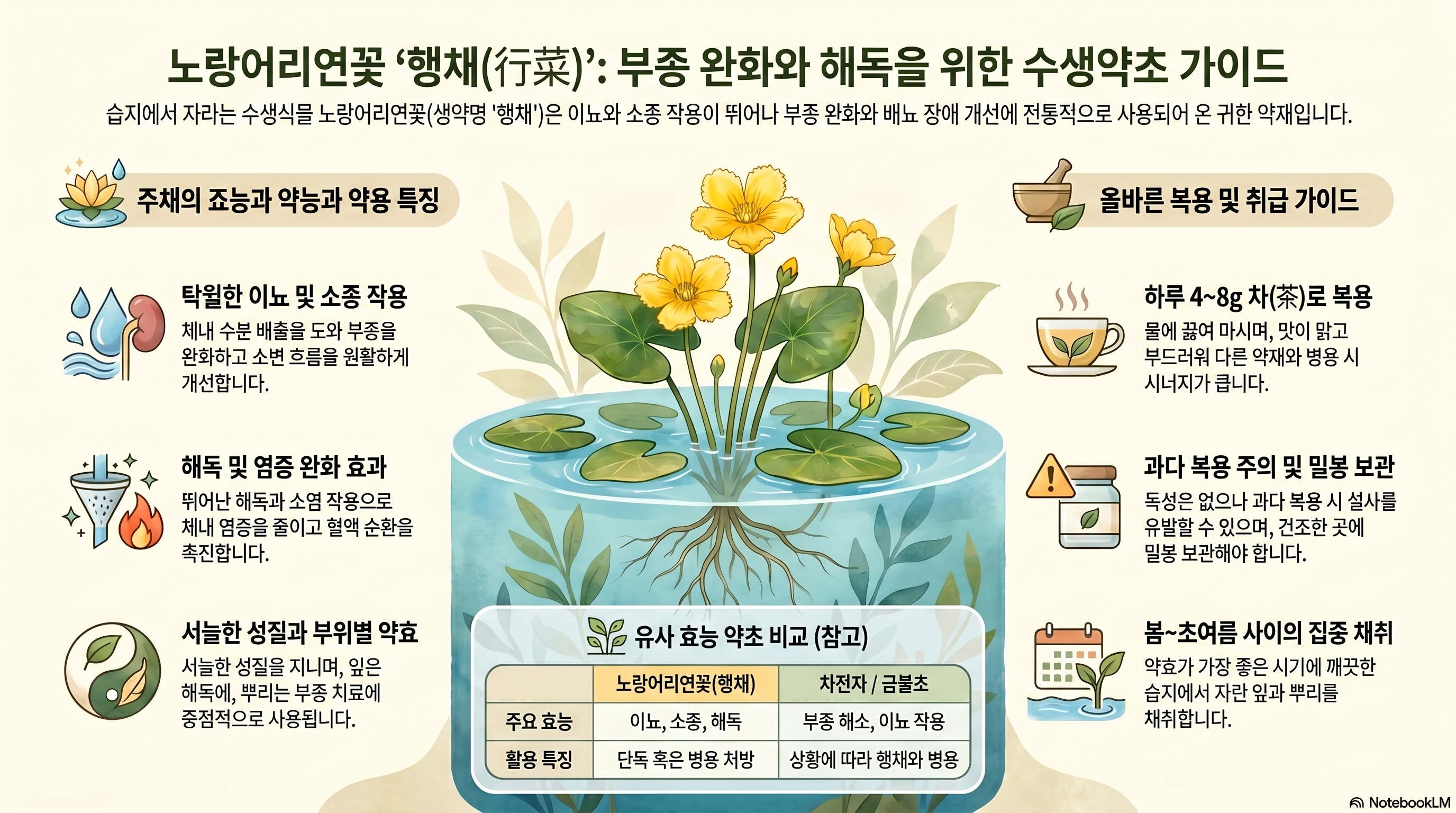행채는 체내 수분 배출을 도와 부종을 완화하고, 소변 흐름을 개선하는 이뇨 작용이 뛰