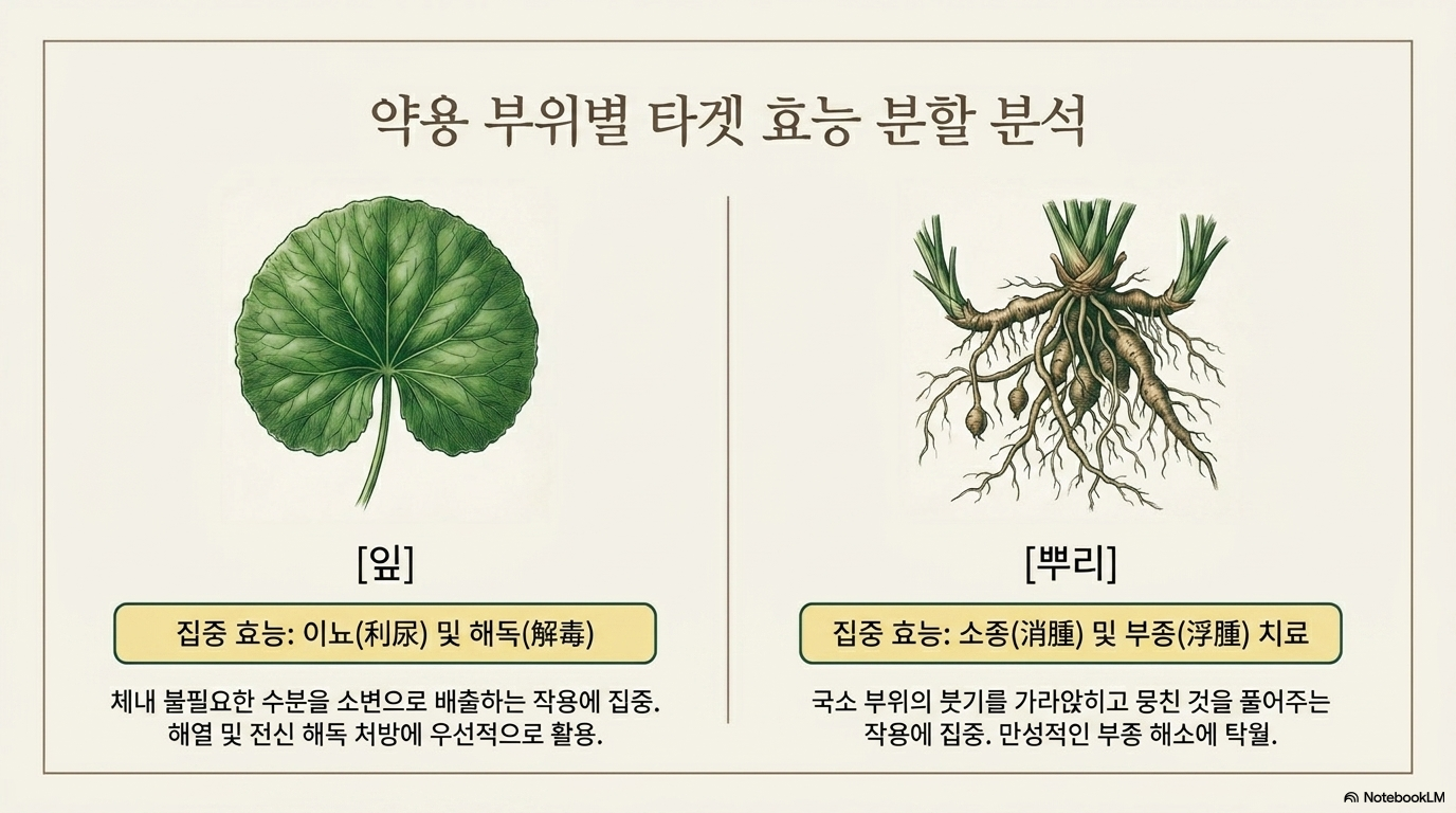 니다. 잎과 뿌리가 주요 약용 부위로, 부종 완화와 배뇨 장애 개선에 특히 효과적입니다.