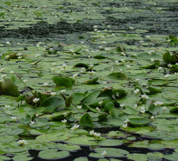 넓고 둥근 잎으로, 물 위에 떠 있거나 주변에 위치합니다.