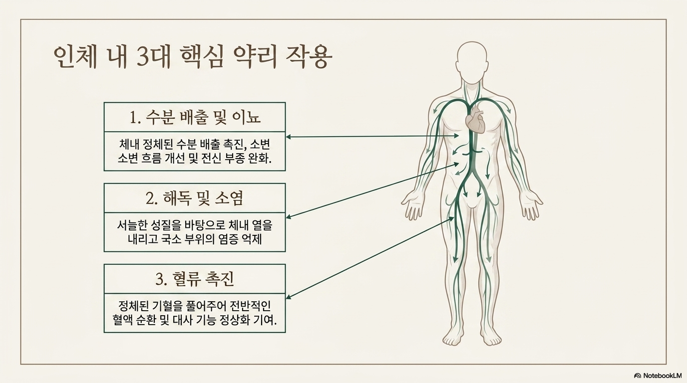 어납니다. 또한 해독과 소염 작용으로 염증 완화에 기여하며, 혈액 순환 촉진에도 긍정