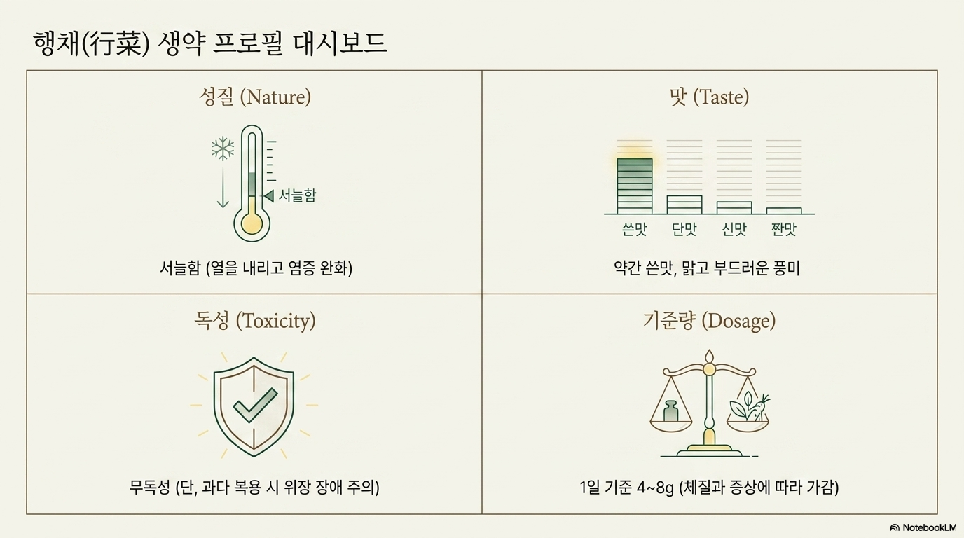 행채는 약간의 쓴맛과 함께 서늘한 성질을 지니며, 열을 내리고 염증을 완화시키는