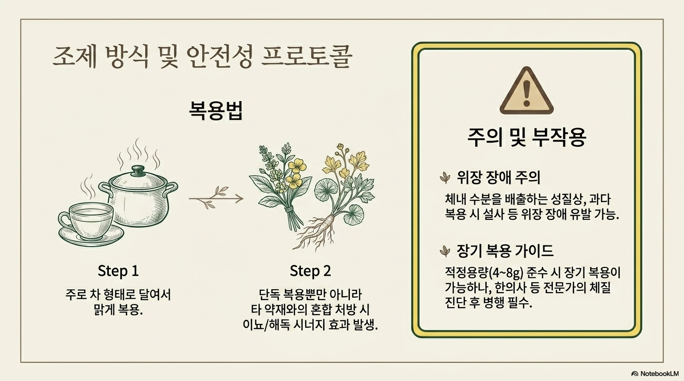 다른 약재와 병용 시 시너지 효과가 커집니다. 체내 수분 순환을 촉진해 부작용이 적고
