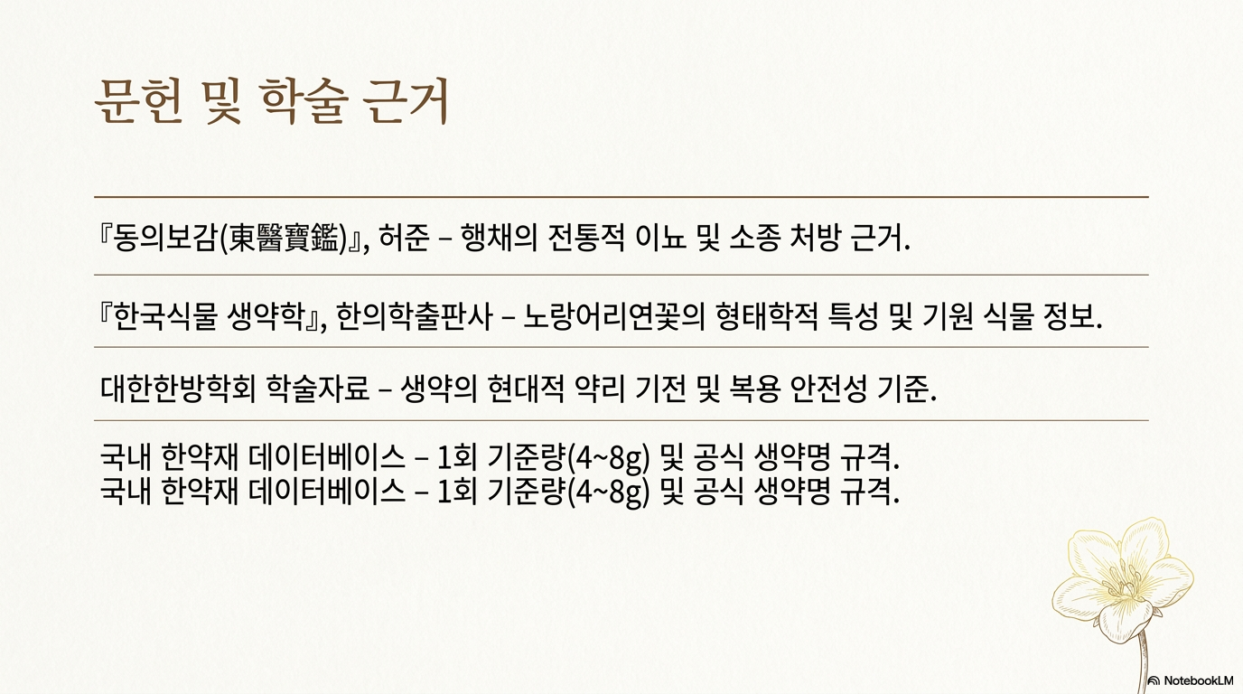 노랑어리연꽃의 생약명은 “행채(行菜)”입니다. 이는 한방에서 공식적으로 인정받는
