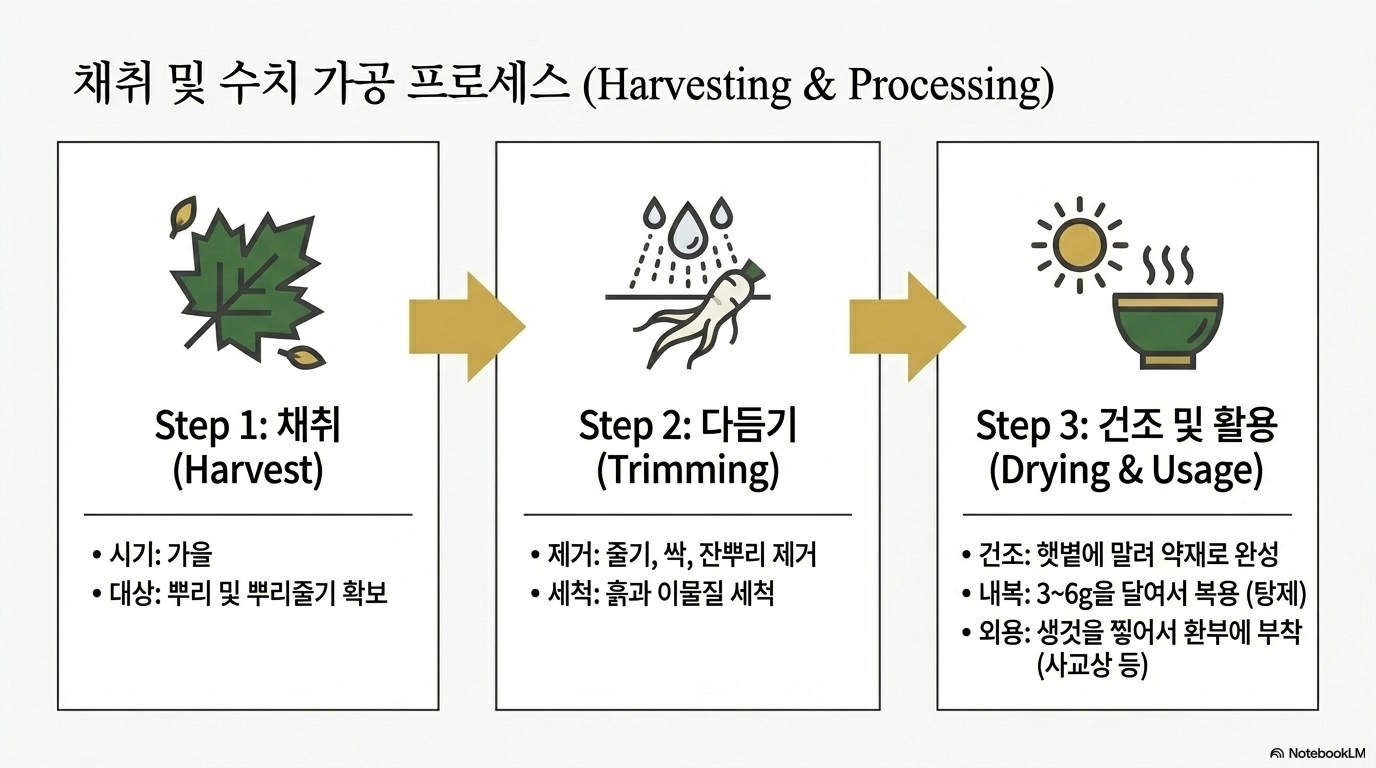 채취한 뿌리는 흙을 잘 털어내고 물에 씻은 뒤 햇볕에 완전히 말립니다. 건조된 약재는