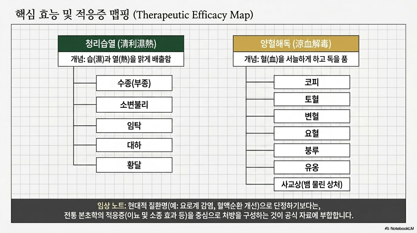 ■ 이뇨통림(利尿通淋):소변 소통을 원활하게 하여 몸의 부기를 빼고 방광염이나 요