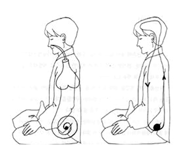 今欲閉氣者 先須靜心 疊足端坐 佛書所謂 金剛坐也 垂簾下視 眼對鼻白